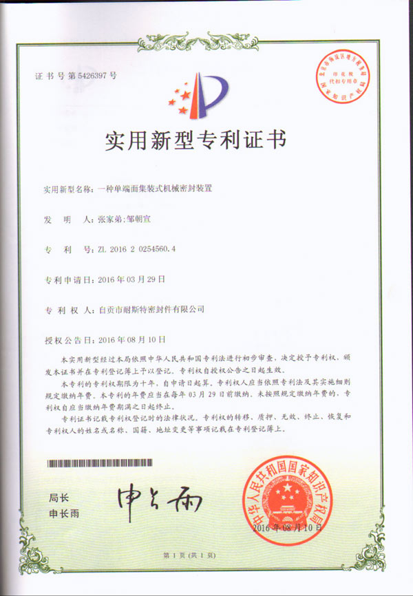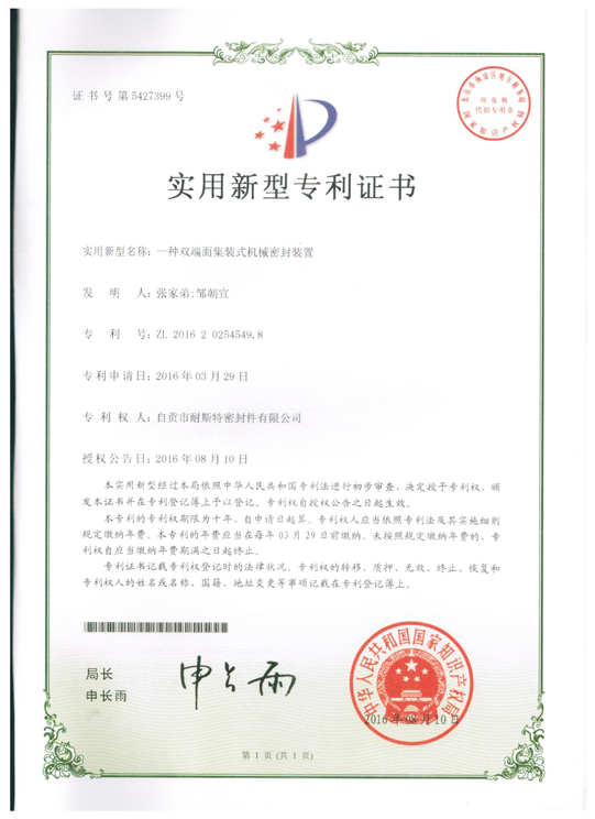 2016年8月10日,耐斯特再获国家知识产权局颁发的2项机械密封相关专利证书。